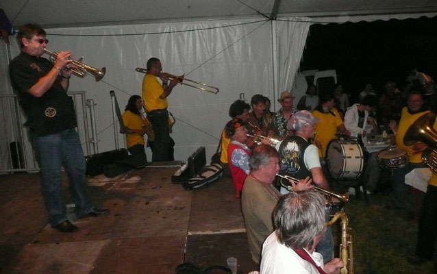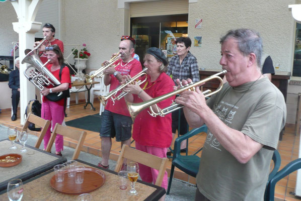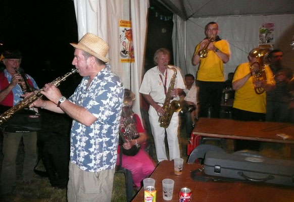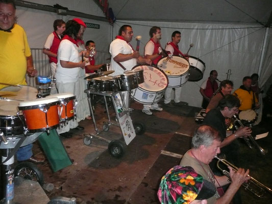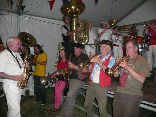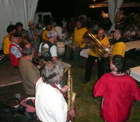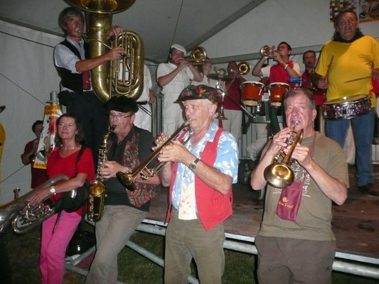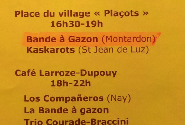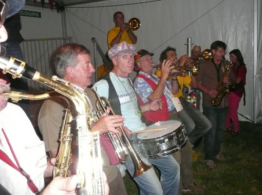 Nous avions entrainé dans l'aventure les copains des Caihabaris qui ne faisaient pas partie de la programmation initiale (en fait ils avaient la tenue "banda" en provenance d'une de leur prestation en début de soirée, mais l'étiquette "Bande à Gazon" quand ils nous ont rejoints).