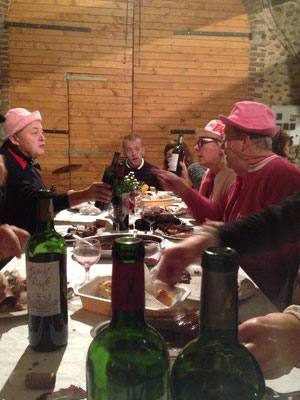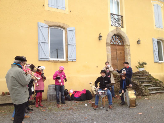 Aubade de la fanfarmonie dans la cour pour les visiteurs oenologues pendant l'apéro, puis repas dans le grand chai avec nos