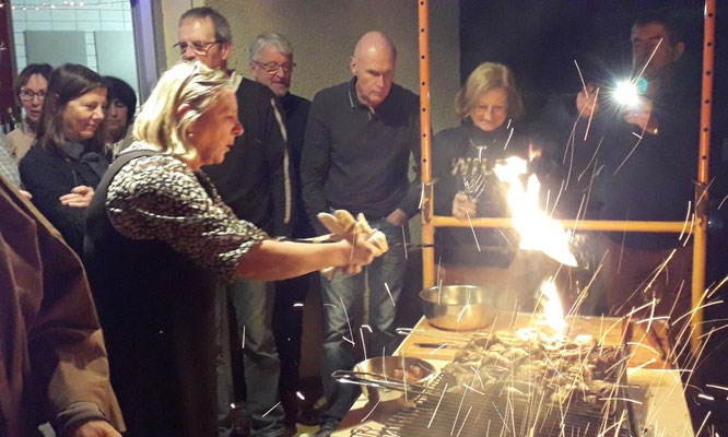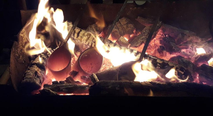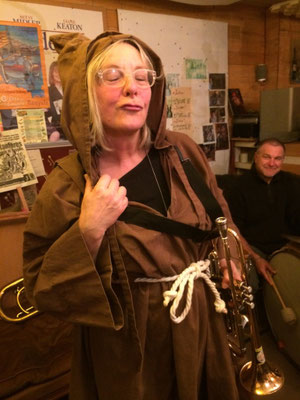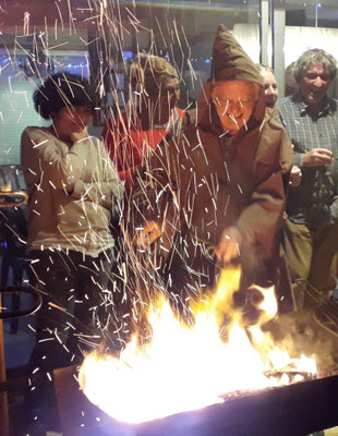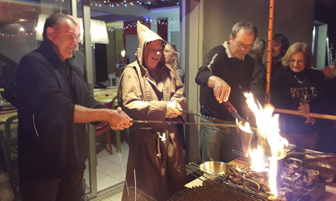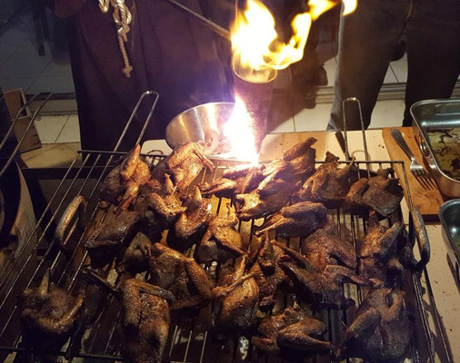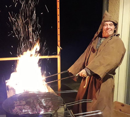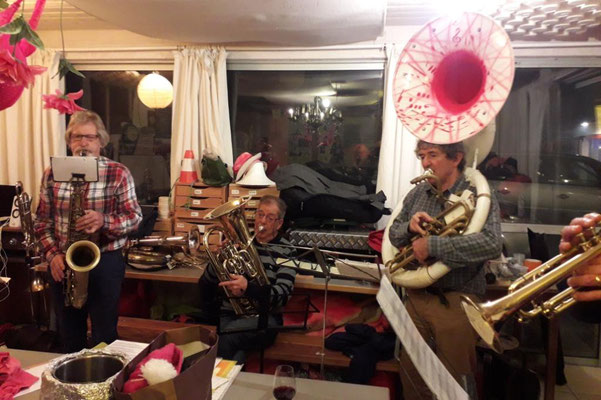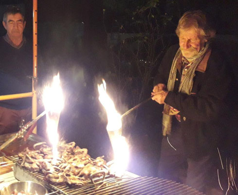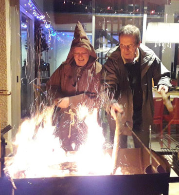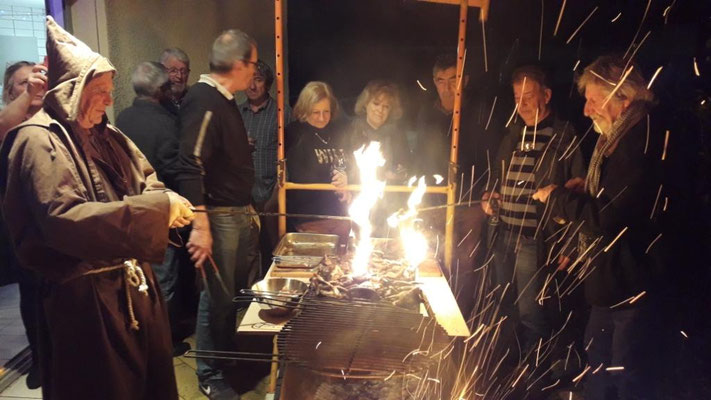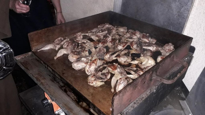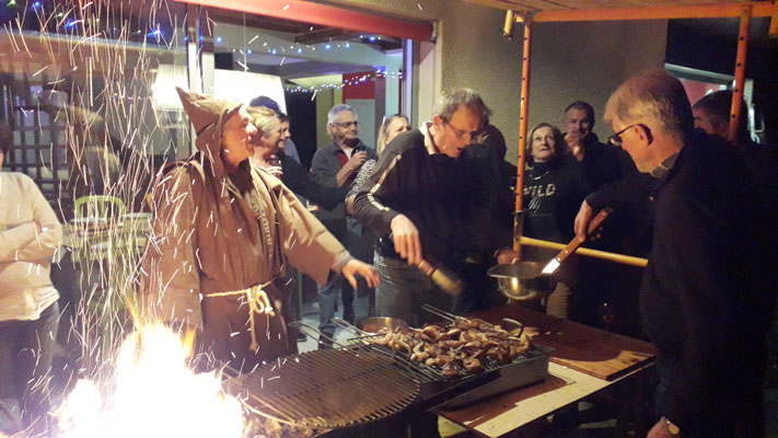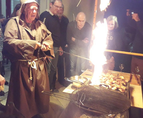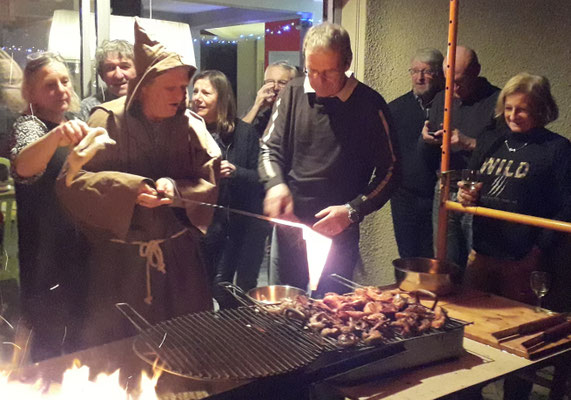 Au delà de la musique les fanfarmonistes ne sont pas insensibles à la gastronomie ( et à l'oenologie ...). Après la traditionnelle répet "choucroute" le jeudi 29 novembre, une répet "palombes au capucin" a été organisée en grande première; Rémy, saxophoniste et chasseur, nous a procuré une douzaine de palombes complétées par 16 cailles ; ainsi les 24 demi palombes ont été cuites au four tandis que les 32 demi cailles l'ont été à la plancha; l'ensemble a ensuite fait l'objet d'un passage spectaculaire au capucin avec une installation "maison".