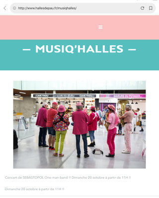 Sur le site des halles de Pau, une photo de la Fanfarmonie prise lors de notre prestation, en support de promo pour l'"homme orchestre Sebastopol" devant se produire le 20 octobre.