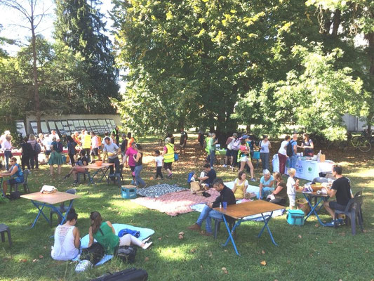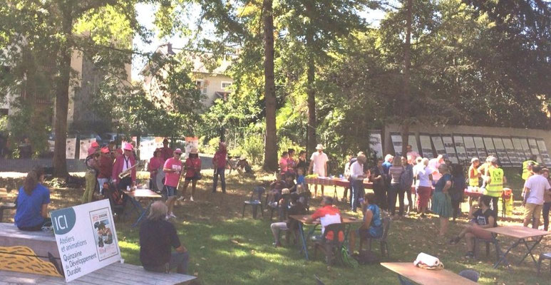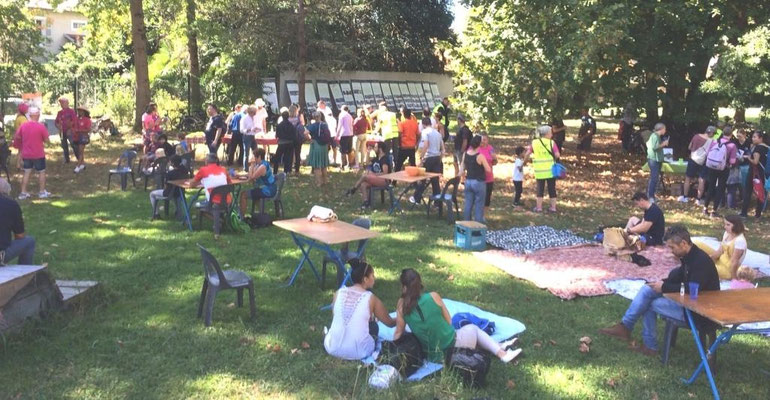 Avec une météo chaude et ensoleillée, un lieu bucolique sous les arbres et une organisation au top l'ambiance a été conviviale et familiale avec les cyclistes, les randonneurs mais aussi les habitants d'un quartier populaire.