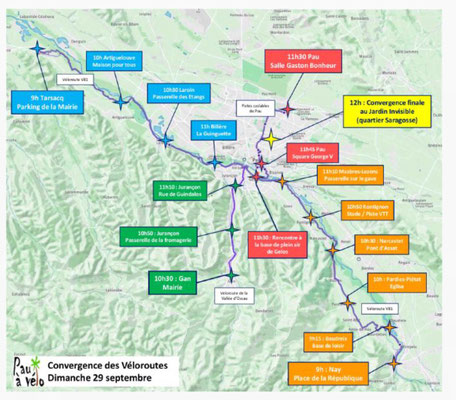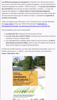 Dans le cadre d'une opération de convergence des véloroutes l'association Pau à Vélo a organisé un pique nique au lieu de convergence dans le quartier Saragosse à Pau. Cette opération a eu lieu à l'occasion de la journée nationale des voies vertes et a clôturé la Quinzaine du Développement Durable coordonnée par Ecocène pour la ville de Pau.
