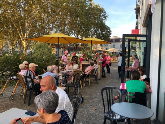 Après une aubade dans le parc de la résidence nous nous sommes tous dirigés - résidents, personnel et fanfarmonistes- au bar Ma bulle Café en bordure de la place François Mitterrand pour une deuxième phase musicale.