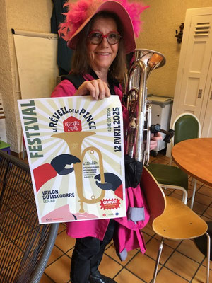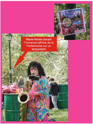 Marie-Renée, notre talentueuse saxo baryton, concentrée sur les croches/doubles croches, dièses/bémols, ... devant l'affiche consacrée à notre formation.