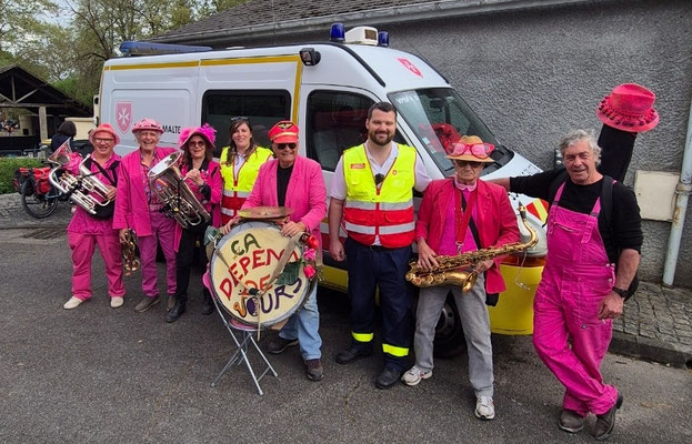 Sur le chemin du départ, arrêt et pose photo avec les secouristes après une petite aubade où nous avons interprété "Tibo", à défaut d'avoir pu jouer "les tuyaux"
